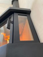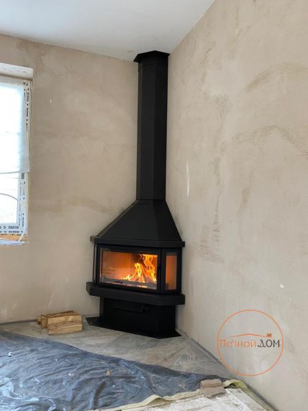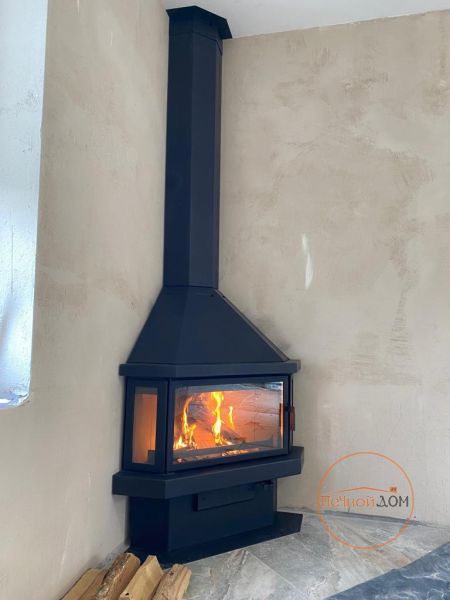 Дровяной камин полностью изготовлен из котловой стали и покрыт черной эмалью. Комплектуется тремя плоскими термоустойчивыми стеклами. Дверца камина открывается вбок. Камера очага футерована шамотом. Металлический дымосборник камина входит в стандартную комплектацию. Предназначен для обогрева помещений до 350м3!