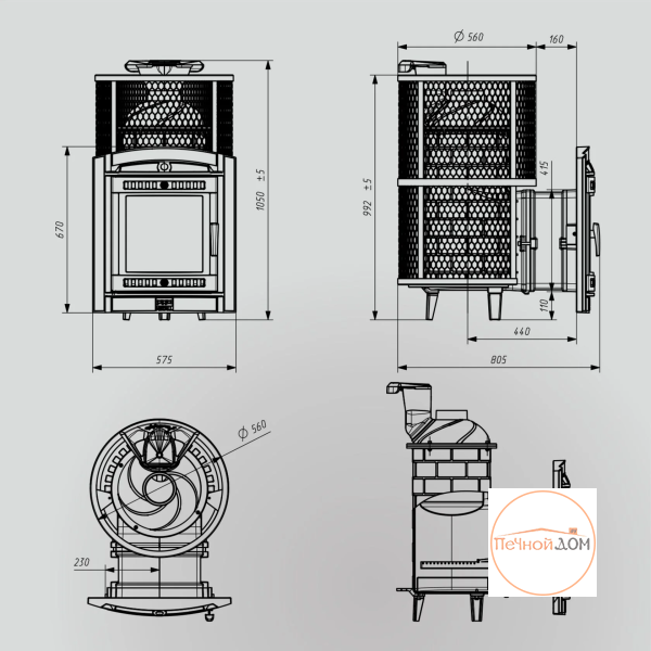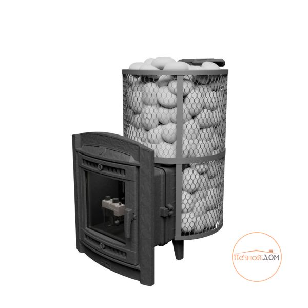 Форма топки с винтовыми каналами закручивает пламя, пламя совершает 3 оборота по топке,а не сразу уходит в трубу, тем самым увеличивая КПД печи на 30%. Два отверстия в топочной дверке для подачи воздуха на горение дают возможность регулировки подачи воздуха, для выбора колосникового и подового горения и позволяют эксперементировать с режимами подготовки парной и выбором процедуры парения. Колосниковое дно с отверстиями позволяет получить равномерное горение по всей площади дна, полноценный прогрев боковых стенок без зон локального перегрева. Подача воды в каменку осуществляется через удобную заливную горловину. Вода проходит через специальный разбрызгиватель внутрь закрытой каменки, где происходит мелкодисперсное орошение горячих камней.