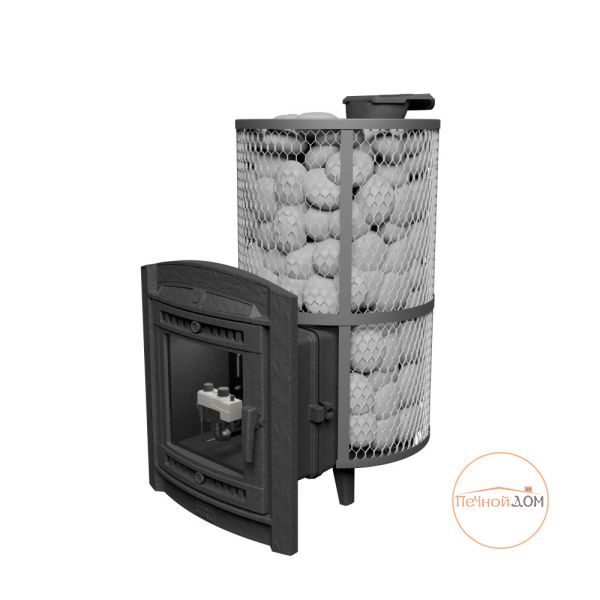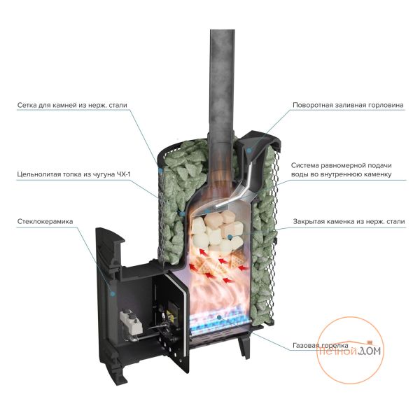 Форма топки с винтовыми каналами закручивает пламя, пламя совершает 3 оборота по топке,а не сразу уходит в трубу, тем самым увеличивая КПД печи на 30%. Два отверстия в топочной дверке для подачи воздуха на горение дают возможность регулировки подачи воздуха, для выбора колосникового и подового горения и позволяют эксперементировать с режимами подготовки парной и выбором процедуры парения. Колосниковое дно с отверстиями позволяет получить равномерное горение по всей площади дна, полноценный прогрев боковых стенок без зон локального перегрева. Подача воды в каменку осуществляется через удобную заливную горловину. Вода проходит через специальный разбрызгиватель внутрь закрытой каменки, где происходит мелкодисперсное орошение горячих камней.