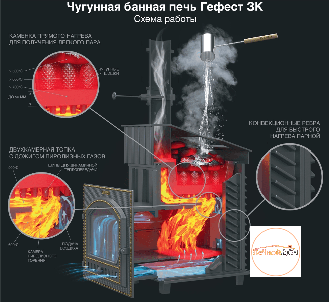Банная печь Гефест Ураган ЗК 25 (М) с уникальной каменкой прямого нагрева для получения легкого мелкодисперсного пара, необходимого для режима русской бани. Благодаря инновационной конструкции, печь гарантированно входит в режим за 60 минут.