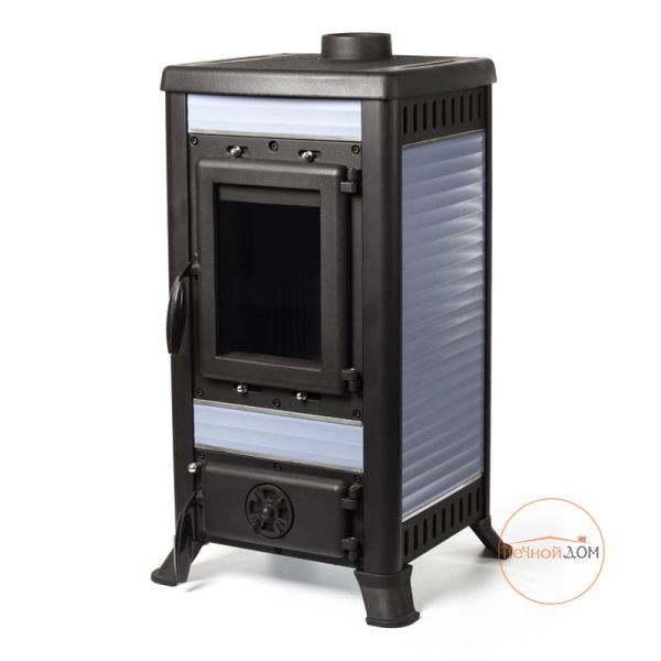 Тепловая мощность печи 8 кВт. КПД 75%. Систем длительного горения, работа в режиме тления до 8 часов. Система обдува стекла. Система сброса золы с колосник. Загрузка дров фронтальная. Диаметр дымохода 120 мм.Расположение дымохода сверху. Отделка антрацит с керамическими вставками белого цвета. Размер стекла 313х221х4 mm. Размер упаковки ДхШхВ: 540х510х950 mm.