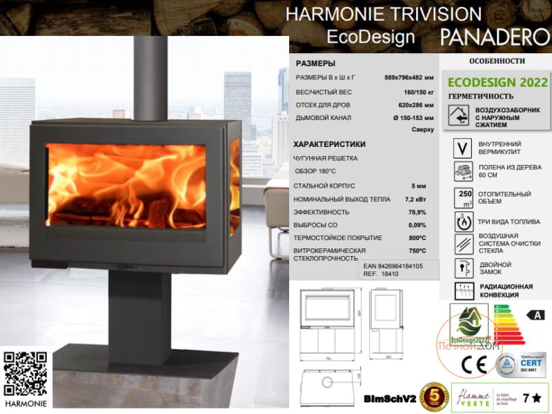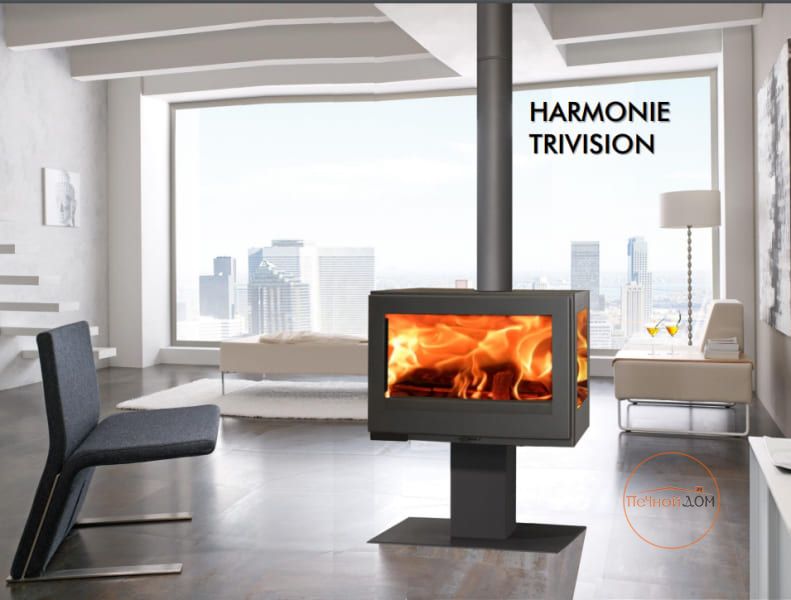 Panadero Harmonie Trivision - стильная камин-печь, рекомендуемая для монтажа в помещениях объемом до 250 куб.м. Печь изготовлена из огнепрочной стали с эмалевым покрытием черного цвета. бллагодаря дополнительным боковым стеклам, огнем можно любоваться из любой точки помещения. Чистоту смотрового окна гарантирует система самоочистки стекла.