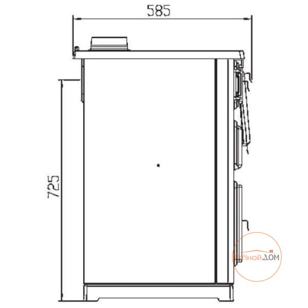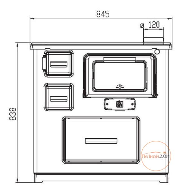 Печь имеет чугунную футеровку, оснащена вместительным духовым шкафом и поверхностью для варки. Изготовлена печь камин из литого чугуна высокого класса, который, как известно, обладает отличной теплоотдачей, благодаря чему помещение нагревается быстрее. А за счет прочности чугуна, печь прослужит более длительное время. Духовой шкаф печи-камина покрыт специальной термоустойчивой эмалью. Дымоход подключается слева или справа.
