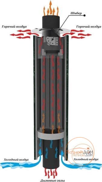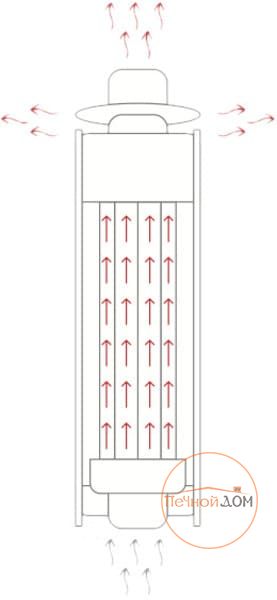 Дымоход "Конвектор" от Vöhringer устанавливается на стартовый участок печи и предназначен для повышения КПД печи за счет конвекции воздуха в помещении. Теплопередача осуществляется через ребра конвекции за счет циркуляции воздуха. Встроенные каналы распределяют потоки воздуха, забирают холодный воздух в нижней части дымохода, нагревают его и передают нагретый воздух в помещение.