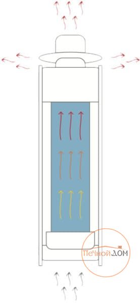 Встроенные каналы распределяют потоки воздуха, забирая холодный воздух в нижней части дымохода, нагревая его и отдавая в верхней части с помощью регулятора. В конструкцию дымохода встроен бак-теплообменник цилиндрической формы (объем - 2,8 литра) из жаропрочной нержавеющей стали толщиной 1 мм. Эффективно использует отходящее тепло от печи, нагревает воду и обеспечивает конвекцию воздуха в парильном помещении. Снабжен шибером, который предназначен для регулировки тяги и обеспечения процесса горения в печах. Надежно фиксируется в заданном положении.