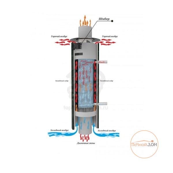 Встроенные каналы распределяют потоки воздуха, забирая холодный воздух в нижней части дымохода, нагревая его и отдавая в верхней части с помощью регулятора. В конструкцию дымохода встроен бак-теплообменник цилиндрической формы (объем - 2,8 литра) из жаропрочной нержавеющей стали толщиной 1 мм. Эффективно использует отходящее тепло от печи, нагревает воду и обеспечивает конвекцию воздуха в парильном помещении. Снабжен шибером, который предназначен для регулировки тяги и обеспечения процесса горения в печах. Надежно фиксируется в заданном положении.