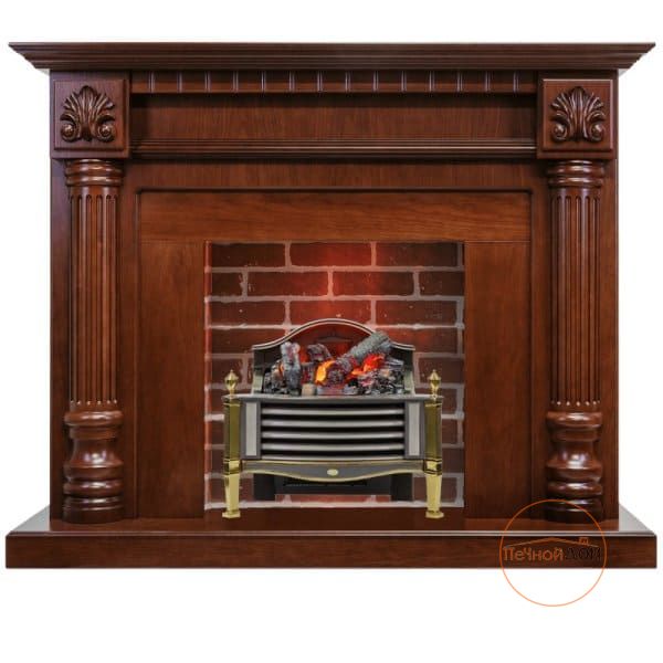 Сам очаг отличается изяществом дизайна - точеные позолоченные ножки поддерживают колосник насыщенного черного цвета, в котором расположены поленья со встроенными светодиодами, что делает их неотличимыми от натурального тлеющего в костре дерева. На задней стенке очага размещены фигурные флористические элементы, которые гармонично сочетаются с общим стилевым решением камина.