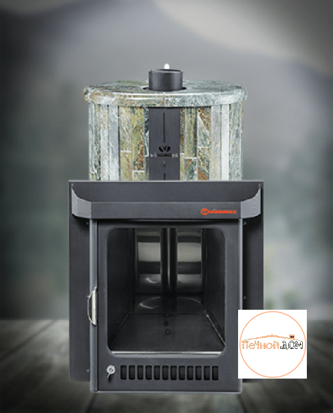 Колосниковая решетка в этой печи для бани на дровах отсутствует. Заложенные дрова разжигают сверху. Не имея над собой препятствий, огонь сразу передает тепло каменке. Пламя постепенно спускается, каждый слой дров прогорает полностью. Система Vortex создает вихревые газовые потоки, не дает пламени подниматься в дымоход. На печь устанавливается дымоотводящий патрубок с рассекателем внутри. Рассекатель изготавливается из жаростойкой нержавеющей стали толщиной 2 мм. Он обеспечивает более эффективную передачу тепла дымовых газов камням. Такие инженерные решения обеспечивают печи высокий КПД, топливо расходуется экономно и эффективно.