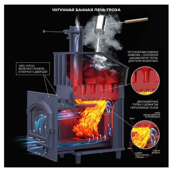 Печь Гроза Ураган 24 (М) с уникальной каменкой прямого нагрева для получения легкого мелкодисперсного пара, необходимого для режима русской бани.