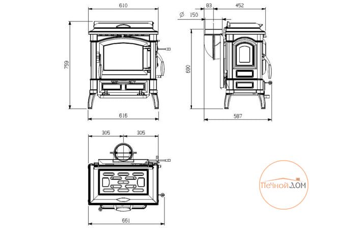 Размеры проема топки у этой печки составляют 380х245 мм, самой топки - 467х380х220 мм.