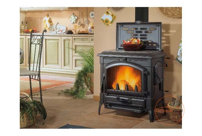 Камин "Isotta con cerchi" - классическая традиционная печь выполнена из высококачественного термостойкого чугуна. Двойная задняя стенка и большой обзор огня. Предусмотрены система вторичного дожига и система – «чистое стекло». Топливо: дерево или гранулы. Цвет печи черный.