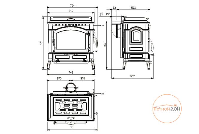 Размеры проема топки у этой печки составляют 519х305 мм, самой топки - 597х360х290 мм.
