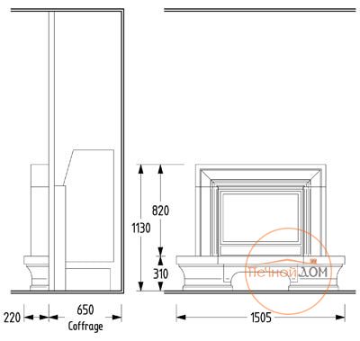 Полувстроенный камин из белого Эдельрока с плитой из черного мрамора.
