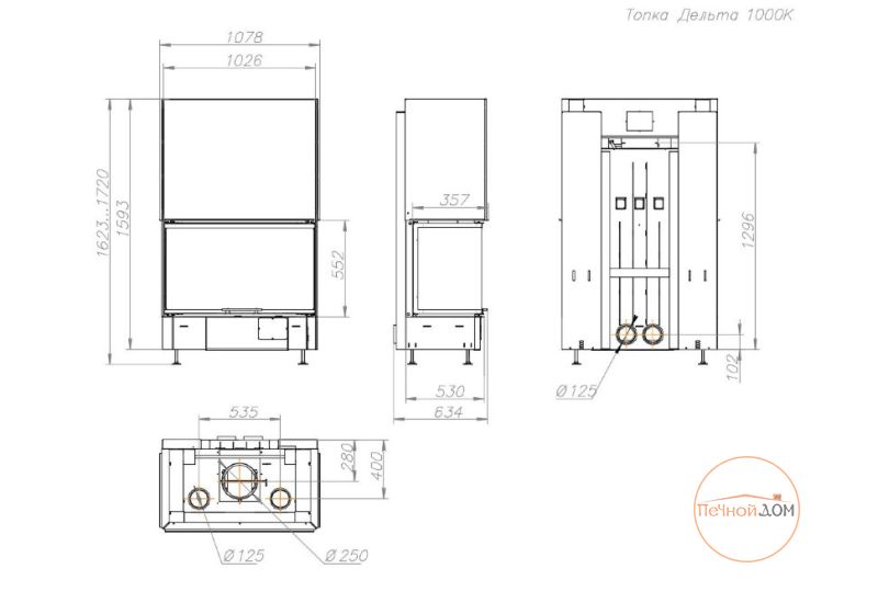 Каминные топки ДЕЛЬТА это сплав наших знаний о современных Европейских тенденциях в области создания каминных топок и требований отечественного покупателя к удобству эксплуатации, внешнему виду и надежности камина. Наши топки принесут в ваш дом атмосферу комфорта, и отлично впишутся в любой интерьер. Мы производим каминные топки из высококачественной котельной стали и наносим термостойкое лакокрасочное покрытие с антикоррозийными свойствами. Топки серии ДЕЛЬТА имеют следующие конструктивные особенности: Топочная камера футерована современным материалом, литьевым шамотом бежевого или черного цвета (по желанию покупателя) и надежно защищает металлические детали корпуса топки от перегрева. Жаропочное стекло из Японии способно выдерживать температуру до 750 С. Система тепловой разводки имеет два встроенных патрубка диаметром 125 мм для подключения системы распределения теплого воздуха в смежные помещения и позволяет увеличить площадь обогреваемых помещений. Система забора воздуха извне, имеет два встроенных патрубка диаметром 125 мм для подключения забора воздуха на горение из соседнего помещения, улицы, подвала, и повышает надежность работы топки. Система очистки стекла эффективно очищает жаропрочное стекло и позволяет любоваться красотой огня. Система вторичного дожега увеличивает КПД топки и позволяет экономить дрова. Встроенная шиберная заслонка позволяет увеличивать/уменьшать сечение дымового канала и регулирует мощность топки. Ребра жесткости по всему корпусу топки и встроенные в дымосборник тепловые каналы позволяют снимать больше тепла и отдавать его в помещение путем конвекции. Высокий дымосборник и пламярассекатель не позволяют дымовым газам попадать в помещение при открывании дверцы. Бесшумная и надежная тросовая система с противовесом и жаропрочными подшипниками, позволяет открывать дверцу топки вверх и производить закладку дров в топочную камеру. Для оптимизации процессов горения все регулировки подачи воздуха на систему первичное горение, систему очистки стекла и встроенную шиберную заслонку производятся специальным ключом «ХОЛОДНАЯ РУКА». Под чугунной колосниковой решеткой в днище топки, находится большой зольный ящик, который удобно вынимается. Устойчивые, регулируемые по высоте ножки, позволяют при монтаже установить топку по уровню.