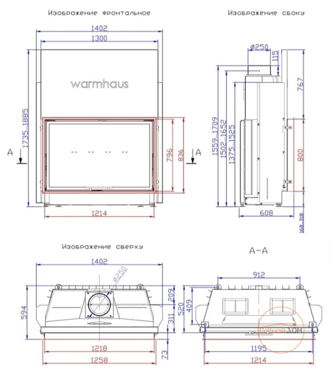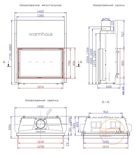 Топка подключается к дымоходу сверху, диаметр дымохода составляет 250 мм. Конструкция предусматривает возможность установки шиберной заслонки (опционально), что даёт дополнительный контроль над тягой и интенсивностью горения.