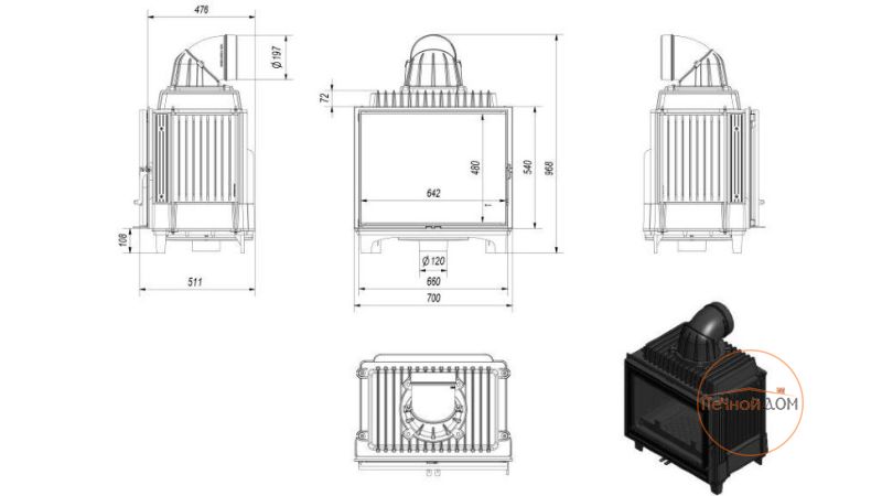 Дверца топки выполнена из термоустойчивого материала, с декоративным исполнением, выдерживающего нагрев в 800 градусов Цельсия.