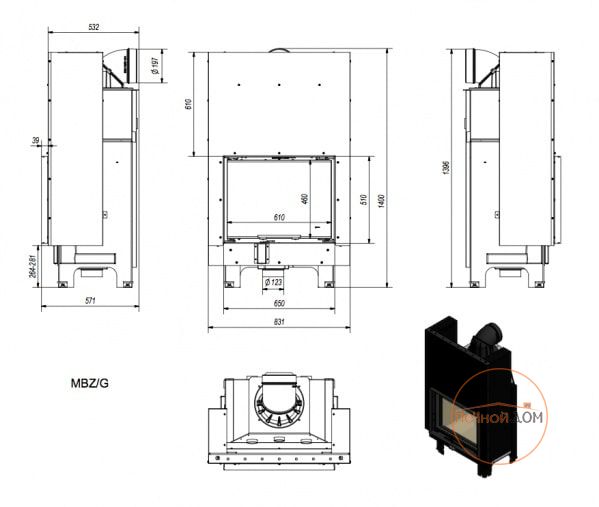 Стальная топка MBZ G может прогревать помещение до 120 кв.м. Топка-гильотина или «топка с лифтом» чрезвычайно популярна сегодня. Поскольку каминные топки используются только с облицовкой, поднятая дверца скрывается внутри этой облицовки, а перед вами остается традиционный открытый камин. Стекло такой топки перемещается вверх и проходит в расположенное вверху сквозное узкое отверстие камина, позволяя топить камин и наслаждаться открытым пламенем, ведь создается полная иллюзия открытого камина при совершенной его безопасности.В конструкцию топки заложен принцип подового горения. Преимуществом подового горения является более равномерный процесс горения в камере сгорания, так как воздух в топку подается по всей ширине топки.Также топка имеет вторичный дожиг (пиролизное горение). При производстве использованы следующие технологические процессы и оборудование: лазерная резка, гибочные станки с ЧПУ, аргоновая сварка, обеспечивающая высокое качество сварочных швов. Топка в базовой комплектации имеет патрубок подачи воздуха, регулируемые по высоте ножки(в пределах 4см). Камера сгорания выложена керамикой Acumotte. Патрубок дымохода может быть направлен назад и вверх.