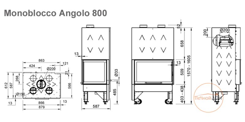 Конструкция прибора модели Monoblocco 800 Angolo имеет возможность произвести разветвление горячего воздуха в другие помещения.