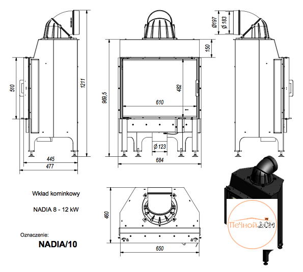 11. Топка оборудована патрубком забора внешнего воздуха,диаметром 125мм, с вмонтироваованной заслонкой,для регуляции подачи воздуха. Регуляция подачи воздуха происходит с помощью ручки.