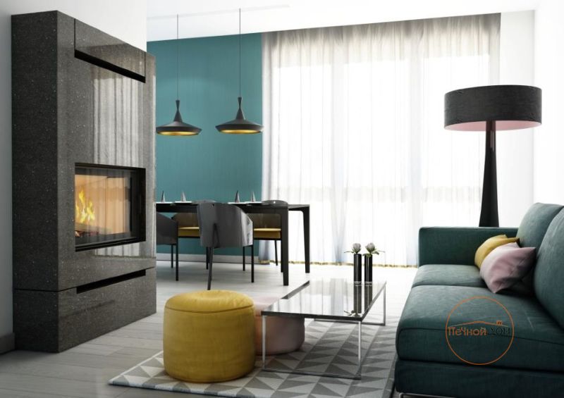 Стекло покрашенно методом трафаретной печати,это придает камину элегантный вид и визуально увеличивает размер камина.