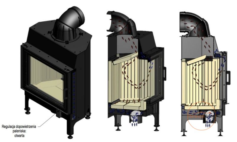 Забор вторичного воздуха отвечает за чистое стекло при этом не происходит забор воздуха из помещения. После закрытия первичного забора воздуха при помощи регулятора на топке забор вторичного воздуха продолжает функционировать. Воздух поступающий в топку распространяется специальными каналами по краям камина.В камере сгорания также есть канал сверху топки,по которому воздух равномерно распространяется по стеклу, благодаря чему оно остаются чистым.