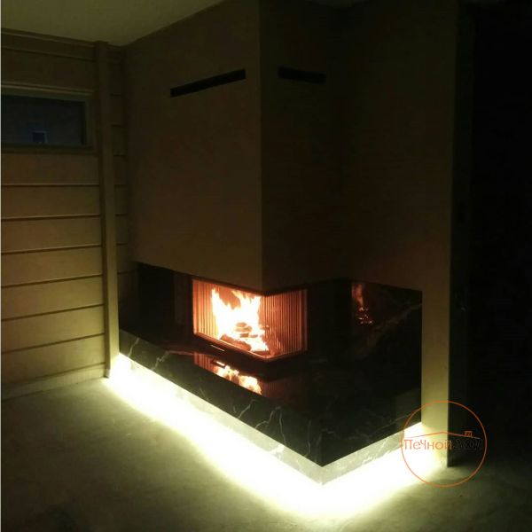 Отсутствие стойки рамки между стеклами создает прекрасный вид на огонь из любой точки помещения и смотрится единым целым.