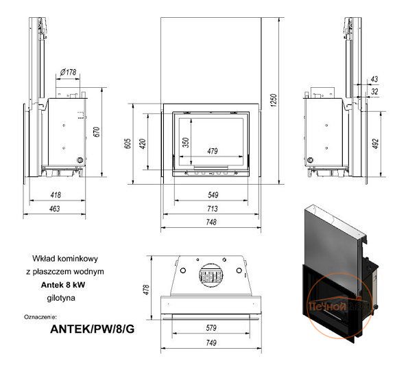 Каминная топка с водяным контуром Antek PW 8 W G W гильотина / Kratki (Польша)