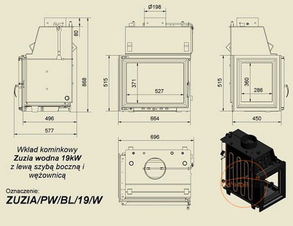 Каминная топка с водяным контуром Zuzia PW BL 19 W Z Г-образное стекло слева,змеевик