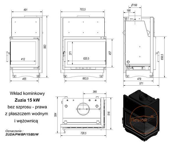 Каминная топка с водяным контуром Zuzia PW BP 15 W Z змеевик Г-образное стекло / Kratki (Польша)