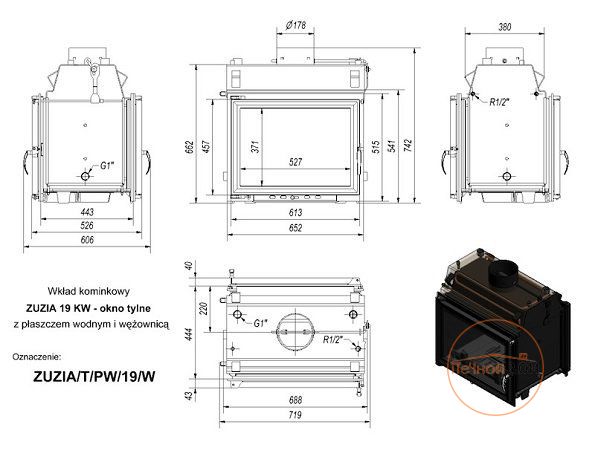 Каминная топка с водяным контуром Zuzia T PW 19 W Z туннельная змеевик