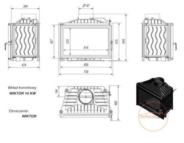 Корпус усилен дополнительными ребрами, улучшающими теплонакопительные характеристики модели. Задняя стенка камеры украшена рельефами в виде языков пламени. Каминная модель имеет боковое открытие и работает на сухих дровах. Выбор чугуна в качестве базового материала изготовления гарантирует быстрый разогрев и медленную отдачу тепла. Монтаж топки следует производить с помощью профессионалов, имеющих большой опыт по установке печей.