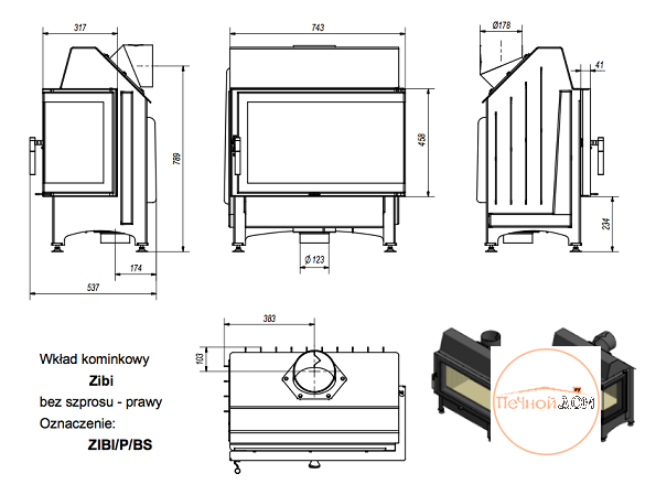 Стальная топка Zibi P BS может прогревать помещение 100-130кв.м. В конструкцию топки заложен принцип подового горения. Преимуществом подового горения является более равномерный процесс горения в камере сгорания, так как воздух в топку подается по всей ширине топки. При производстве использованы следующие технологические процессы и оборудование: лазерная резка, гибочные станки с ЧПУ, аргоновая сварка, обеспечивающая высокое качество сварочных швов. Топка в базовой комплектации имеет патрубок подачи воздуха, регулируемые по высоте ножки(в пределах 4см). Камера сгорания выложена керамикой Acumotte. Патрубок дымохода может быть направлен назад и вверх.