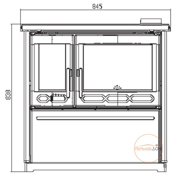 Дверка топочной камеры и дверка духовки выполнены из огнеупорной стеклокерамики , которая может выдержать температурный режим, доходящий до 750 С.