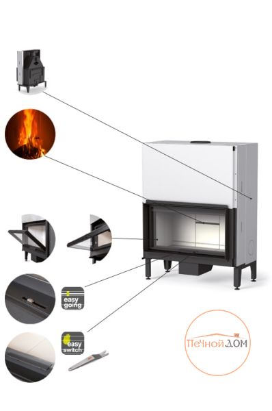 В зависимости от личных предпочтений пользователь может как использовать ручку дверцы каминной топки, так и снимать её благодаря системе Easy Switch (Изи Свич), тем самым визуально освободить рамку от дополнительных линий, углов и ребер. В таком случае для подъёма дверцы используется специальный ключ поставляемый в комплекте. Для очистки стекла предусмотрено фронтальное открывание дверцы: на 90°, если ручка снята, и на 45°, если ручка установлена.