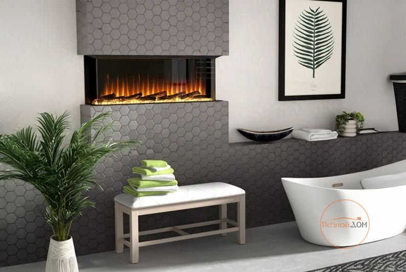 С помощью специальных переходников можно совместить несколько электрокаминов в единую линию любой длины. Камин во всю стену эффектно выглядит как в частных интерьерах, так и в общественных пространствах.