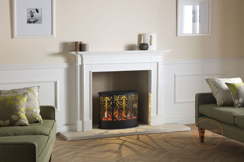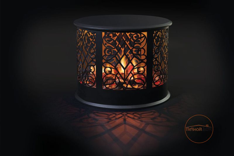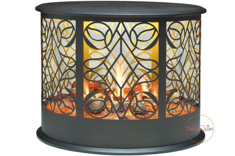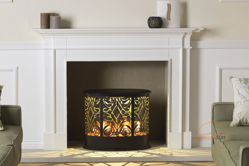 В камине задняя стенка представляет собой LED-поверхность, на которую проецируется реалистичное изображение ярко пылающего очага с разлетающимися искрами. В камине предусмотрен и звуковой эффект потрескивающих поленьев. Данная серия очагов не требует топлива, камин работает от электросети.