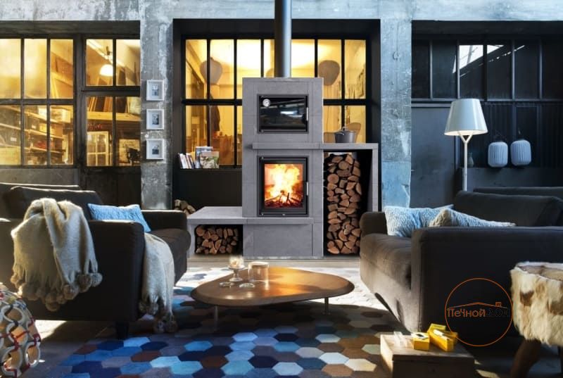 малоэтажных коттеджей и для приготовления еды. Модель печи максимально приближена к Классической деревенской дровяной печи с духовкой. Изделие заводского исполнения. Модель отличается высокой производительностью: благодаря ей можно очень быстро прогревать помещение. Печь имеет особую, тщательно продуманную конструкцию, которая позволяет ускорять распространение теплого воздуха в комнате. Теплоёмкий материал облицовки печи создаёт дополнительный обогрев благодаря лучистому теплу от разогретого камня внешней облицовки.