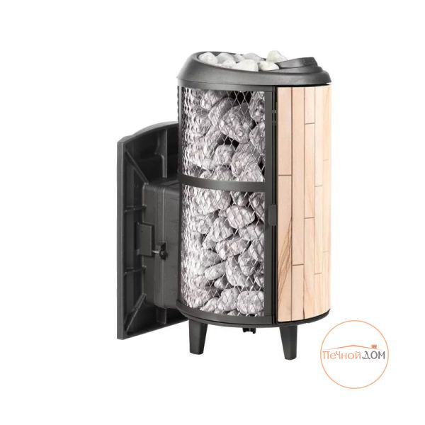Модель с комбинированной облицовкой из сетки и ламелей. Особенность модели - открывающаяся дверь с ламелями. Это оригинальное решение обеспечивает быстрый прогрев парной.