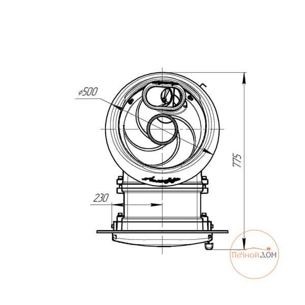 Форма топки с винтовыми каналами закручивает пламя, пламя совершает 3 оборота по топке,а не сразу уходит в трубу, тем самым увеличивая КПД печи на 30%. Два отверстия в топочной дверке для подачи воздуха на горение дают возможность регулировки подачи воздуха, для выбора колосникового и подового горения и позволяют эксперементировать с режимами подготовки парной и выбором процедуры парения. Колосниковое дно с отверстиями позволяет получить равномерное горение по всей площади дна, полноценный прогрев боковых стенок без зон локального перегрева. Подача воды в каменку осуществляется через удобную заливную горловину. Вода проходит через специальный разбрызгиватель внутрь закрытой каменки, где происходит мелкодисперсное орошение горячих камней.