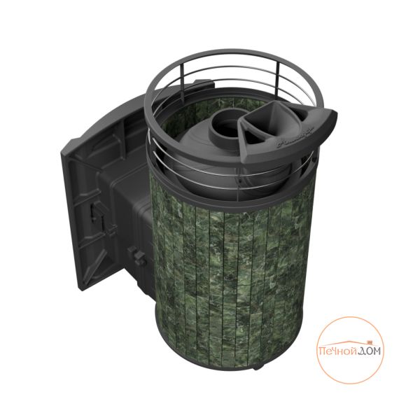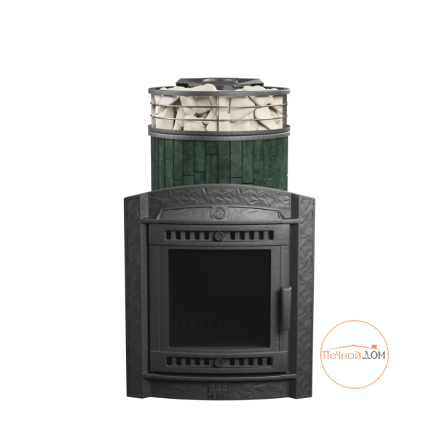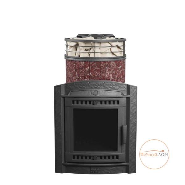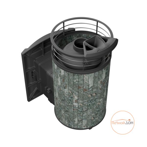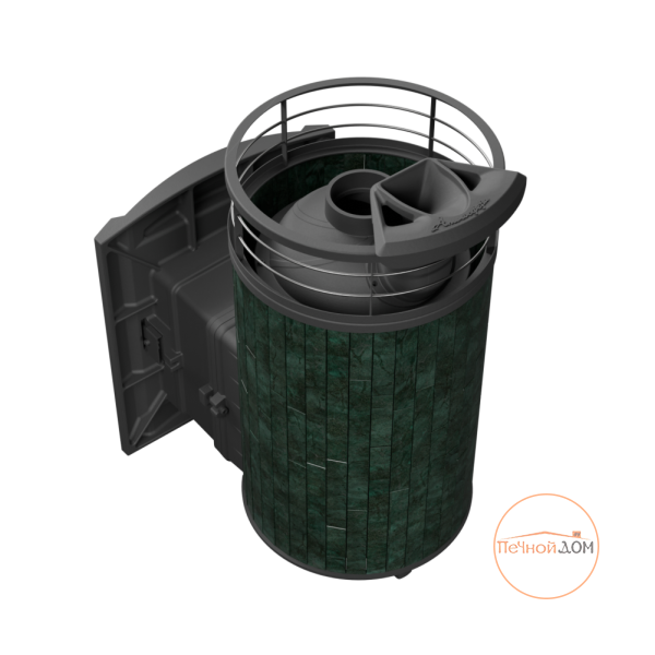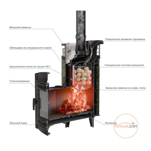 Форма топки с винтовыми каналами закручивает пламя, пламя совершает 3 оборота по топке,а не сразу уходит в трубу, тем самым увеличивая КПД печи на 30%. Два отверстия в топочной дверке для подачи воздуха на горение дают возможность регулировки подачи воздуха, для выбора колосникового и подового горения и позволяют эксперементировать с режимами подготовки парной и выбором процедуры парения. Колосниковое дно с отверстиями позволяет получить равномерное горение по всей площади дна, полноценный прогрев боковых стенок без зон локального перегрева. Подача воды в каменку осуществляется через удобную заливную горловину. Вода проходит через специальный разбрызгиватель внутрь закрытой каменки, где происходит мелкодисперсное орошение горячих камней.