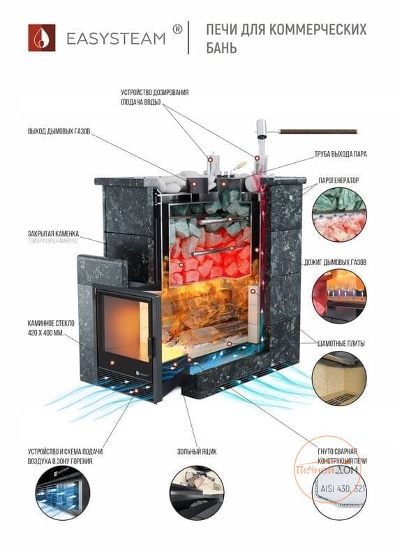 Печь оснащена съёмной закрытой каменкой, позволяющей разогревать находящиеся в ней камни до температуры 600 градусов