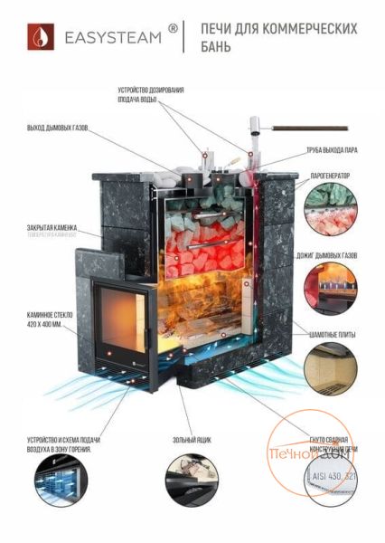 Печь оснащена съёмной закрытой каменкой, позволяющей разогревать находящиеся в ней камни до температуры 600 градусов