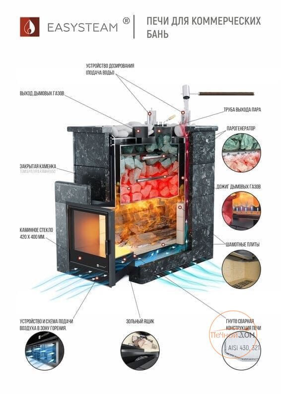 Печь оснащена съёмной закрытой каменкой, позволяющей разогревать находящиеся в ней камни до температуры 600 градусов
