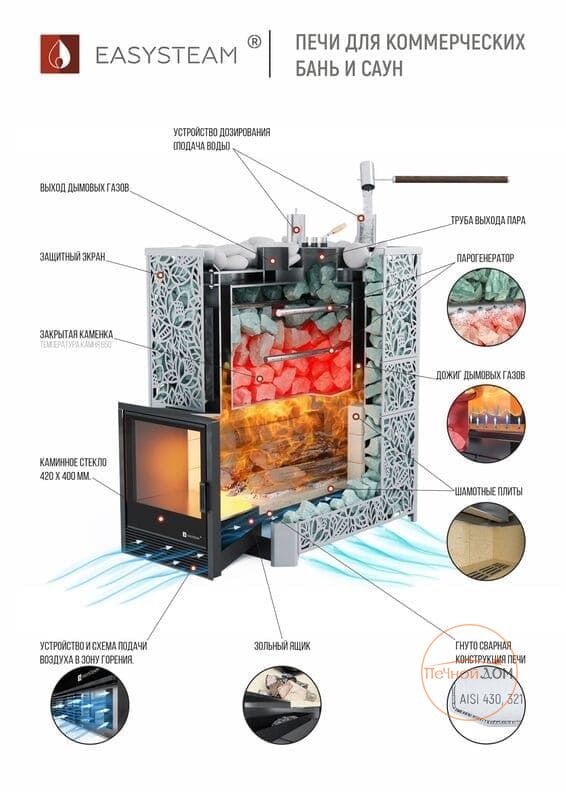 • Печь оснащена съёмной закрытой каменкой, позволяющей разогревать находящиеся в ней камни до температуры 600 градусов