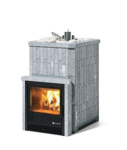 Печь оснащена съемной закрытой каменкой, топка печи футерована шамотными плитами. В стандартную комплектацию печи входит индивидуально разработанный кожух из натурального камня толщиной 40 мм с регулируемой конвекцией. На печи уменьшен топочный канал для удобства топки из парного помещения.