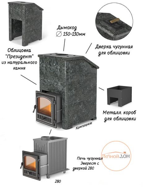 Комплект ПРЕЗИДЕНТ "ЭВЕРЕСТ 24 (280)" ТАЛЬКОХЛОРИТ имеет эксклюзивный дизайн и удачно впишется в практически любой интерьер парного помещения. Облицовка из натурального камня придаст интерьеру лоск и респектабельность.