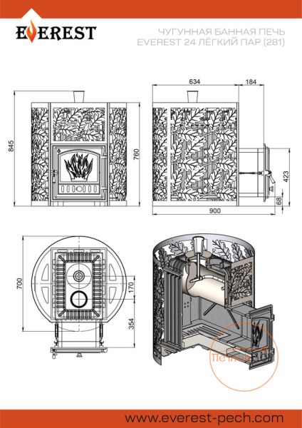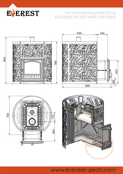 Банные печи Эверест 24 Лёгкий Пар из жаропрочного чугуна отличает наличие закрытой каменки, выполненной из экологичной, экономичной нержавеющей стали марки AISI 430.Такое дополнение в обновленном ряду Эверест позволяет получить от печей серии Лёгкий Пар любую требуемую разновидность пара. Капельная подача воды, через специальную систему в закрытую каменку, позволяет получить качественный перегретый мелкодисперсный пар в нужных количествах, не боясь залива каменки. При этом лучшие характеристики линейки печей Эверест из жаропрочного чугуна остались на высоком уровне:заводской чугун оптимальной толщины;большая теплоёмкость;значительная мощность печи;простая для установки конструкция.