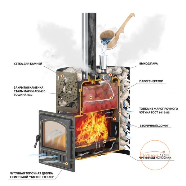 В комплектацию входит: Сборная печь со съёмным топочным тоннелем и чугунной дверкой.Цилиндрическая закрытая каменка из нержавеющей стали марки AISI 430, рассчитанная на загрузку 35-40 кг камней мелкой фракции.Система капельной подачи воды на камни закрытой каменки.Канал для подачи воздуха в область вторичного дожига.Массивный чугунный колосник.Зольный ящик, выполненный из прочной стали, позволяющий оперативно проводить уборку печи.Стальной конвекционный кожух для укладывания камней.Термостойкий герметик для сборки печи.Инструкция по монтажу и эксплуатации.