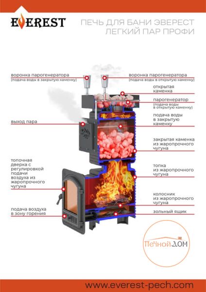 Поворотная чугунная банная печь EVEREST Лёгкий Пар ПРОФИ предназначена для обогрева парных помещений объёмом до 40 кубических метров и получения пара при эксплуатации в частных и коммерческих банях.