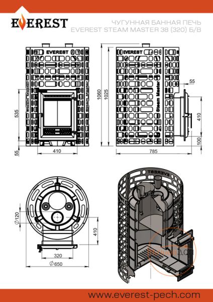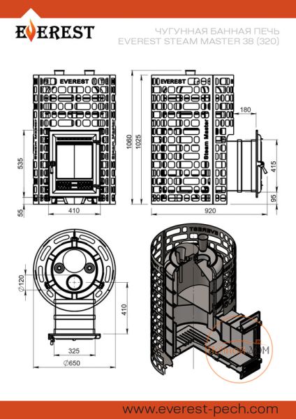 Банная печь Эверест "Steam Master" 38 (320) ЧУГУН предназначена для нагрева помещений и получения пара в парных объёмом до 38 кубических метров.
